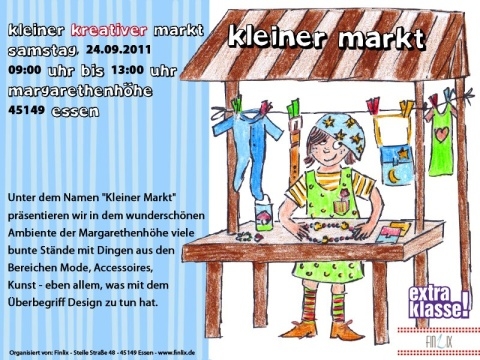 Am kommenden Samstag, den 24. September 2011, findet in der Zeit von 9 bis 13 Uhr auf der Margarethenhöhe gleichzeitig mit dem Wochenmarkt ein kleiner Kreativmarkt statt. Organisiert wird das ganze von meiner Kollegin Sandra Erbert von Finlix im Rahmen der Veranstaltung „extraklasse!“, und wir hoffen ganz fest auf tolles Wetter und viele Besucher. Wir freuen uns auf Sie!